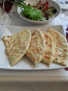 placek chaczapuri imeruli (15,00) – to wielki pszenny placek z serem w środku, podany z sosem jogurtowo-czosnkowym. Muszę przyznać, że porcja ta okazała się za duża jak na drugą kolację i dałam radę zjeść tylko jeden kawałek. Pozostałe zabraliśmy do domu