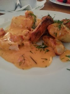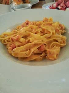 Tego dnia trafiłyśmy na dania z szyjek rakowych. Do sandacza i tagliatelle zamówiłyśmy sałatę toskańską (dla zbicia indeksu glikemicznego makaronu i ziemniaków:).