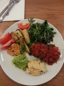 W minioną niedzielę Bar Studio miał pyszny i zdrowy bufet – z hummusem, pastą z groszku, z fasoli, falafelem, szakszuką, sałatką z kaszy kuskus, rukolą z burakami i serem, pieczonymi warzywami, sałatą z kalafiora… Dostałam ślinotoku i jednocześnie bezdechu z zachwytu. Jak dziecko w Smyku, oniemiała pokazywałam Pani palcem co ma nałożyć na mój talerz – nie ma tu samoobsługi a za każdy smakołyk naliczana jest opłata – 4,00 zł.