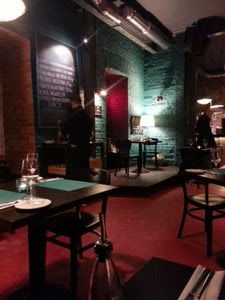 Na dworze siarczysty mróz skutecznie zniechęcał do spacerów, w taką pogodę psa na dwór bym nie wyprowadziła, ale jeść trzeba i jak się nie chce gotować w domu to cztery litery należy z niego ruszyć – nawet w mróz. Udało mi się zaparkować stosunkowo blisko i nie zamarznąć po drodze z parkingu do Hoża by Mondovino. W środku było ciepło i przytulnie – dzięki ciemnym ceglanym ścianom, nastrojowemu oświetlenie, czerwonym sofom. Tworzą one klimat idealny na degustację wina czy whisky (a wybór jest tu zacny i jednego i drugiego) jednak dla mnie zbyt ciemny aby w pełni chłonąć wygląd serwowanych dań (wolę spożywać zawartość mojego talerza w jasnym świetle).