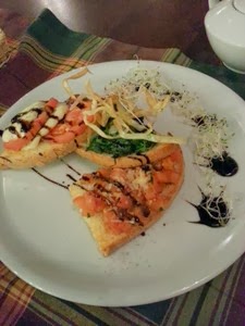 bruschetta tricolore (18,90) – trzy grzanki z pomidorami, mozzarelą oraz blanszowanym szpinakiem. Byłyby lepsze gdyby nie polano ich słodkim balsamico – kiełki mogę jeszcze odpuścić (po prostu ich nie jadłam – i nie dlatego, że nie lubię – owszem są dobre do sałat ale nie do wszystkiego jak leci) ale to balsamico zabiło cały smak bruschetty
