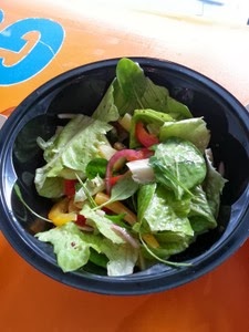 sałatki jako dodatek (po 450,00 HUF i 650,00 HUF czyli 6,71 i 9,70 zł) – zamiast frytek, zamówiłam dwie choć różniły się od siebie niewiele – zaledwie kilkoma składnikami – kaparami, winogronami.