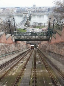 Po pierwsze już nie pamiętam jak to się stało ale na mapie zaznaczyłam sobie Bubba’s Water Gill pod Górą Zamkową od strony Dunaju. Wysiadłam z autobusu i nic nie znalazłam. Zaczepieni ludzie z troską na twarzach (później już wiedziałam skąd ta troska – to było daleko) wskazali mi kierunek, w którym powinnam się udać w poszukiwaniu stacji Deli – na drugą stronę góry. Postanowiłam ułatwić sobie sprawę i na górę wjechałam zabytkowym funikularem z 1870 roku (takim wagonikiem – jeden jedzie do góry a drugi w tym samym czasie zjeżdża). Przy okazji zaliczyłam wspaniały widok na Dunaj i most Łańcuchowy: