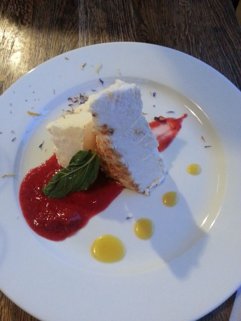M zamówił pieczonego łososia (34,00) – podanego z sosem z marynowanego zielonego pieprzu, wina i śmietany a do tego sałatę verde (20,00) z cykorią, gruszką i gorgonzolą w dressingu cytrynowo-miodowym. Smak prostych składników podkreślono sosami. Wszystko było dobrze skomponowane i co najważniejsze – smaczne.