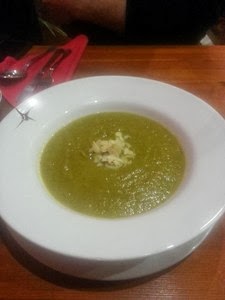 M rozpoczął wieczór od zupy dnia (jedynej w ofercie zupy) czyli kremu brokułowego (14,00), który ocenił jako smaczny i aromatyczny. Miał w sobie śmietanę więc ja spasowałam.
