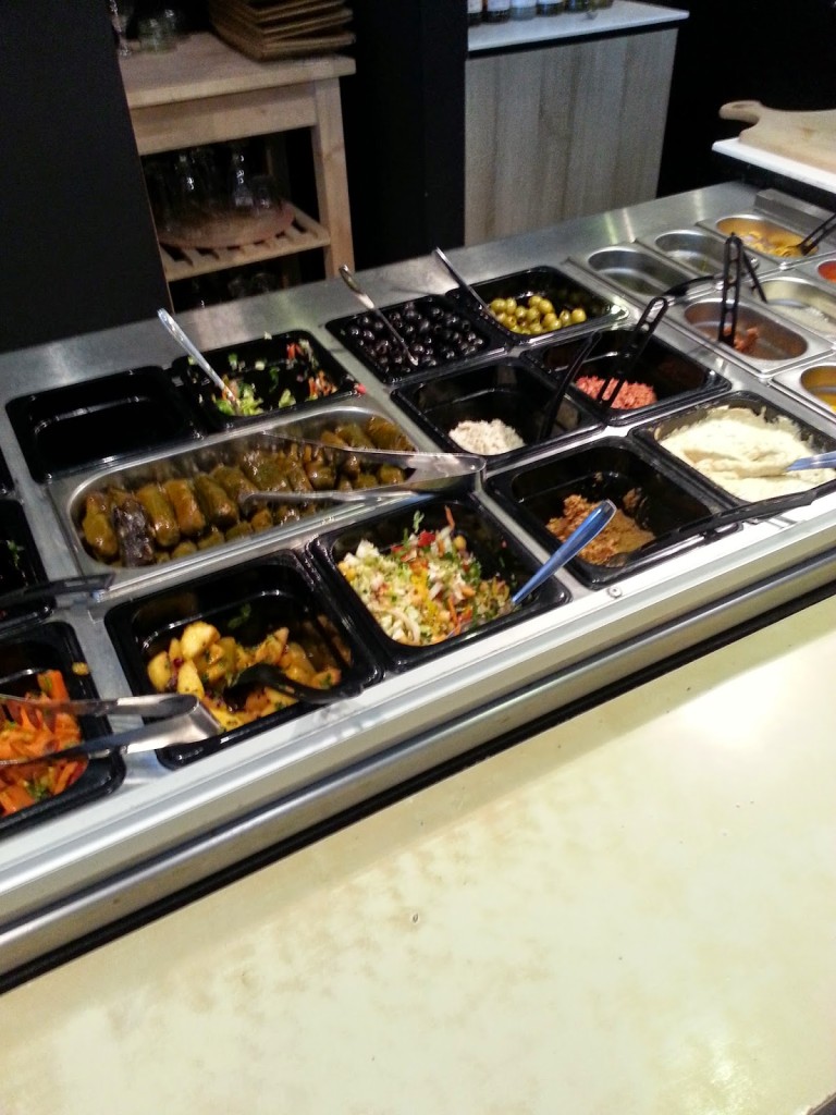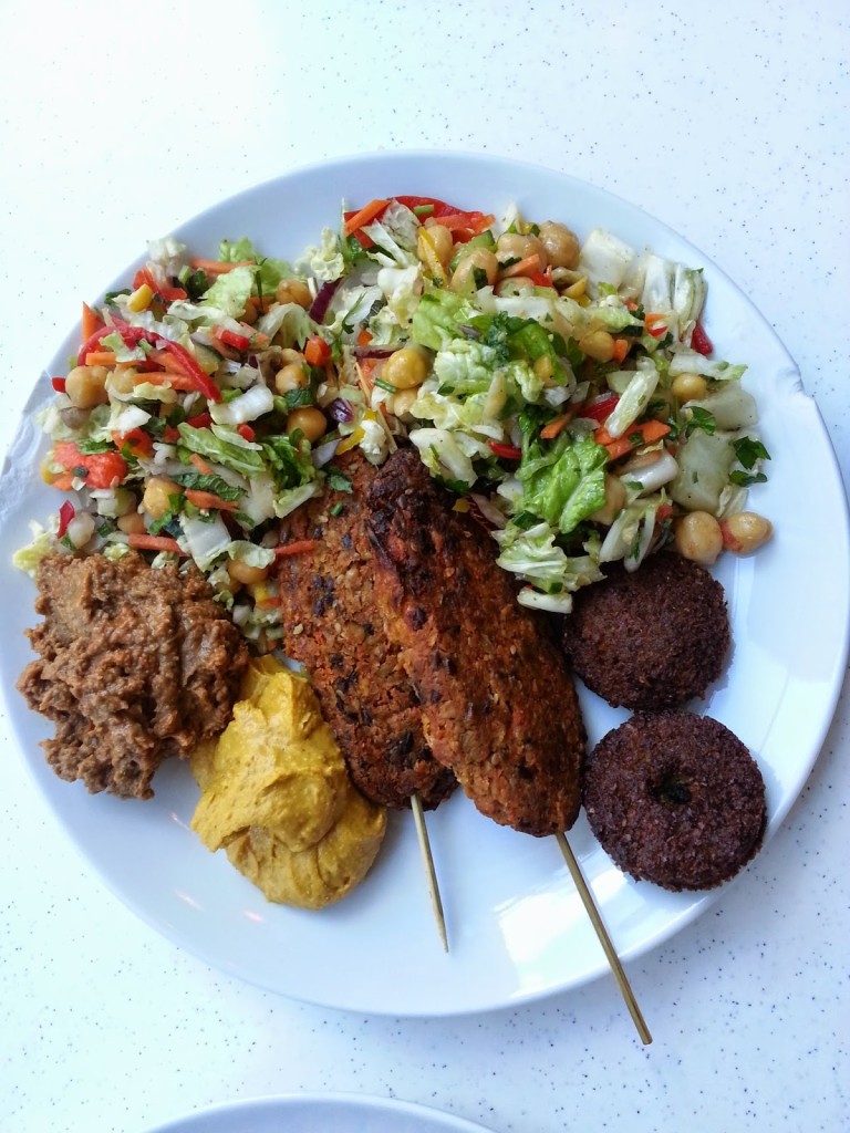 M wybrał sałatkę, falafele, kofty, hummus z curry, pastę z fasoli – na uwagę zasługuje hummus z curry – pikantny, wyraźny, warty spróbowania
