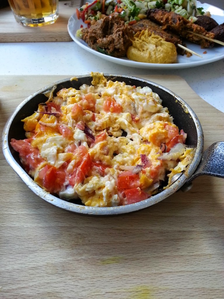 Pomysł z patelnią nie jest nowy ale sprawdza się przy zamawianiu dużych śniadań – jajecznica nie stygnie tak szybko jak na talerzu:)