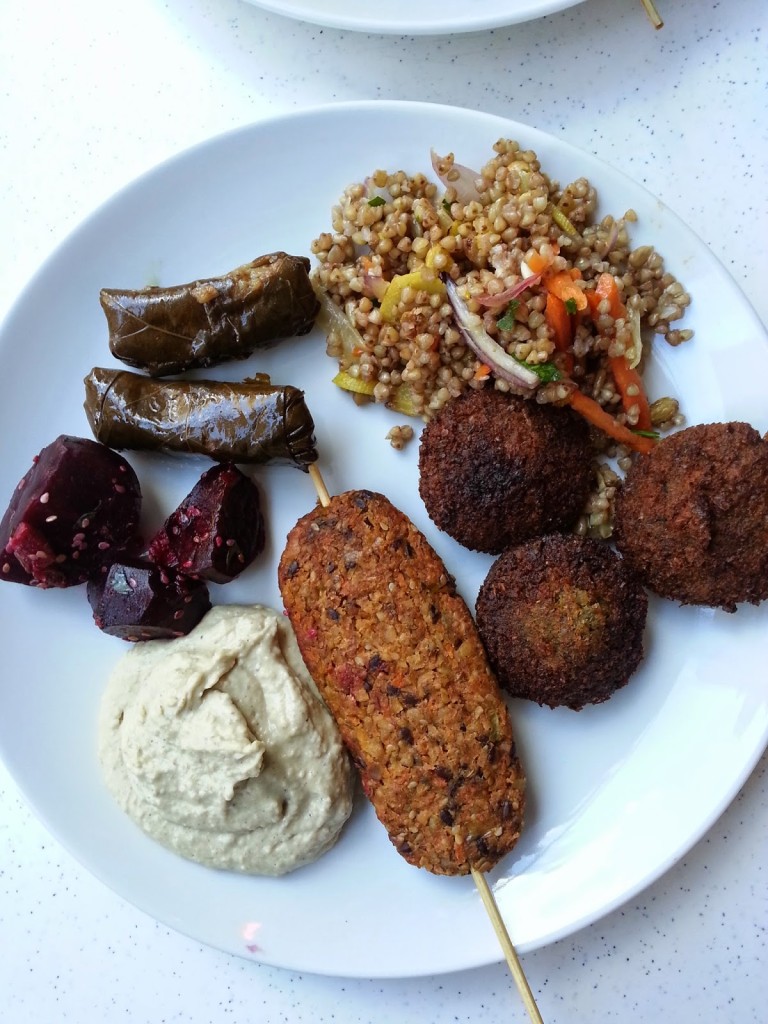 tofu i ziaren, hummus, buraki, dolma (faszerowane liście winogron) – pyszny i zdrowy miks smaków.