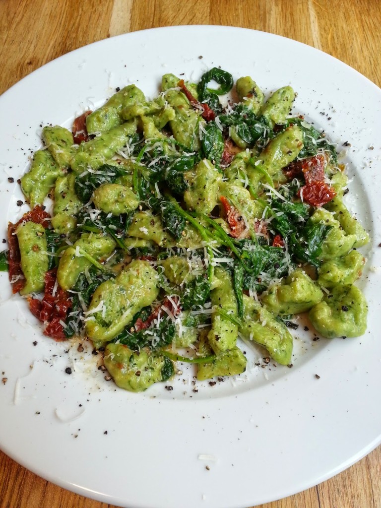 Ręcznie robione gnocchi ze szpinakiem (28,00) w sosie z klarowanego masła i szałwi, podane z suszonymi pomidorami. Wygląd dnia nie zachwyca. A smak – mdły, bez wyrazu, niestety dominuje w nim masło.