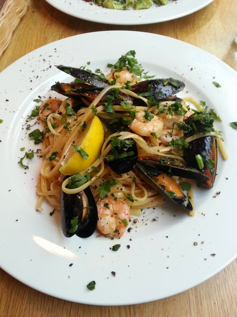 mój wybór to makaron z krewetkami i małżami (34,00) w lekkim sosie z wina i masła, zieloną pietruszką i pieprzem. Krewetki i małże były bardzo dobre – sprężyste i soczyste. Makaron kompletnie nie do zjedzenia – twardy, przesiąknięty masłem – pytam po co?? Po co to masło dodawane do wszystkiego? Dominuje ono w potrawach, przeciąża je, zabija smak pozostałych składników. O zdrowotnych aspektach jedzenia masła nie będę już się tutaj rozpisywać. Jeść nie polecam.