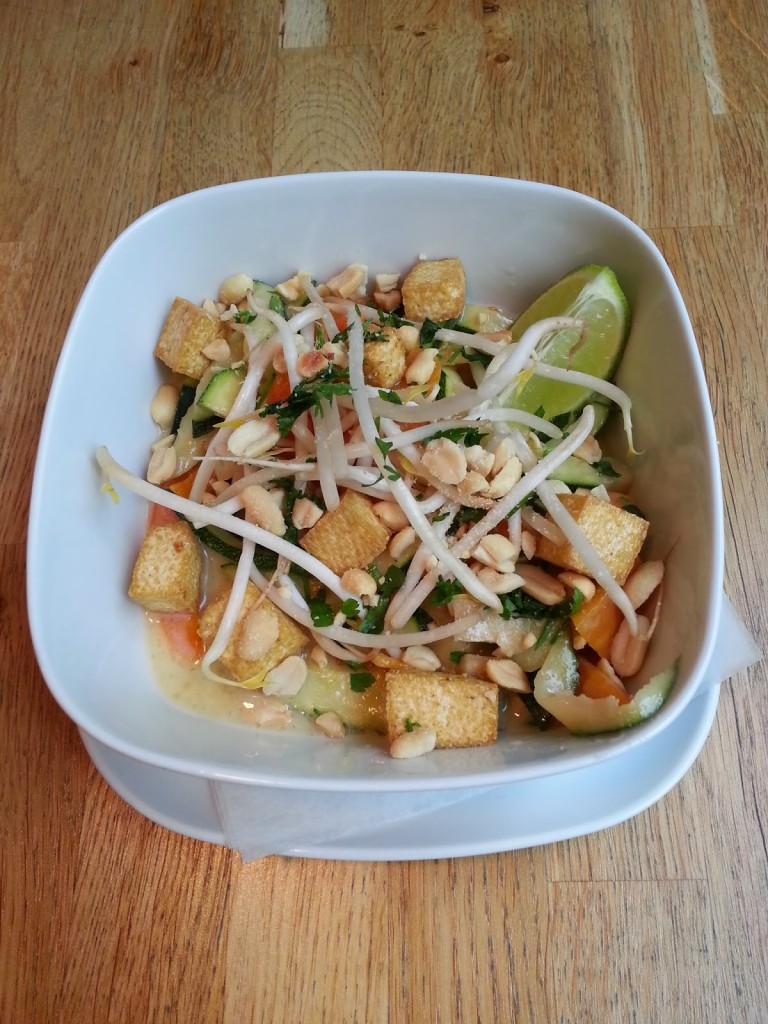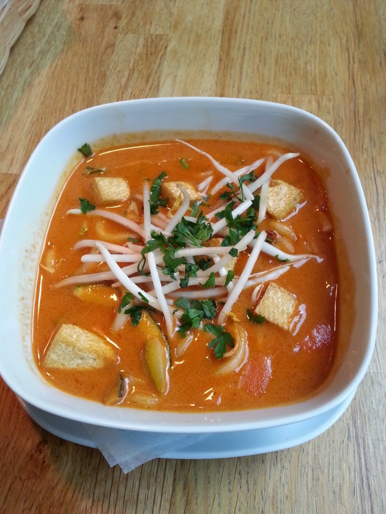 Zupa azjatycka (26,00) z warzywami, mlekiem kokosowym, kiełkami, makaronem udon. Ja wybrałam z tofu (do wyboru był jeszcze kurczak lub krewetki). Już z kuchni uderzył w nas zapach sosu rybnego – kto go zna wie, że powalić może nawet twardziela nieczułego na zapachy letniego, przekiszonego, miejskiego śmietnika (kuchenne zapachy pozostały z nami na długo po wyjściu – na ubraniach, a siedzieliśmy daleko od kuchni, przy samym oknie). Na szczęście sama zupa swoim zapachem zachęcała do próbowania. Zaskoczyła mnie jej nadmierna kwasowość, której nie było w stanie zwalczyć delikatne mleczko kokosowe. Zawartość nie powalała – kilka kawałeczków marchewki, kiełki, smażone tofu, ale krem w konsystencji i smaku był bardzo dobry.