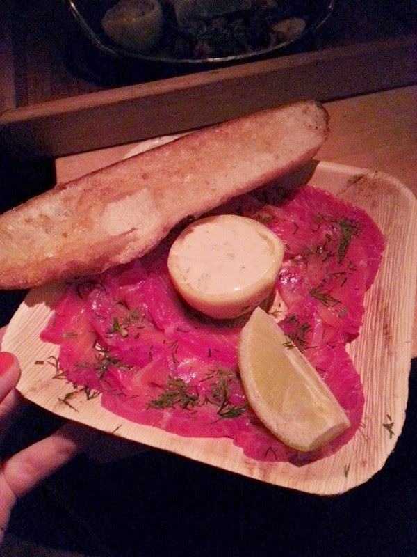 gravlax (21,00) – czyli płaty łososia peklowane w soli, podane z cytryną i bagietką. Pozycja lekka jak na Kraken Rum Bar – dobra na początek wieczoru