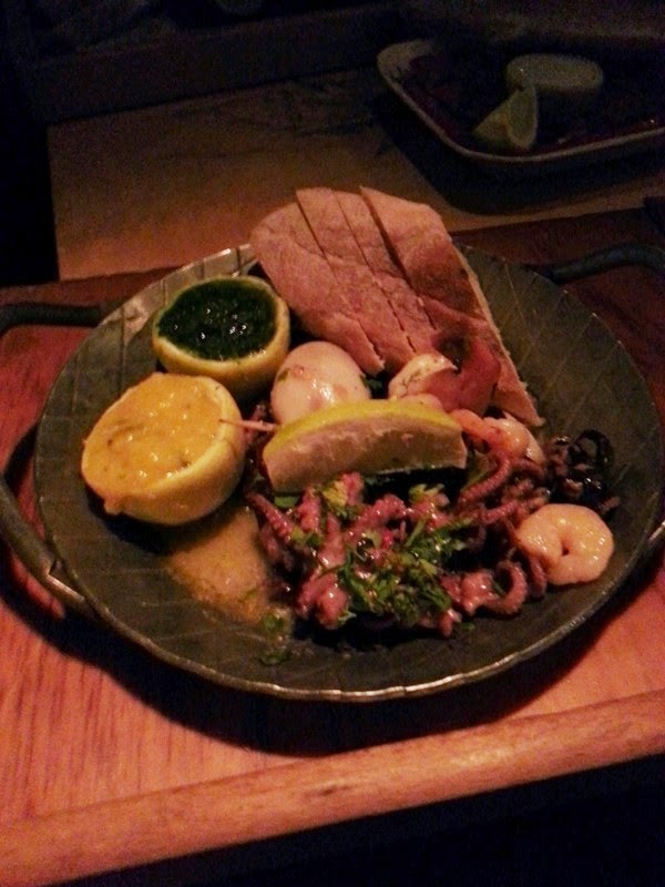 mój ulubiony – sea food mix (28,00) – czyli duszone krewetki, ośmiorniczki baby, kalmar nadziewany pikantnym kuskus, podane z pikantnym sosem pietruszkowym oraz słodkim pomarańczowym. Danie tak dobre, że nie znudziło mi się przez ponad rok. To przy nim łamię się i wylizuję bagietką sos do ostatniej kropli