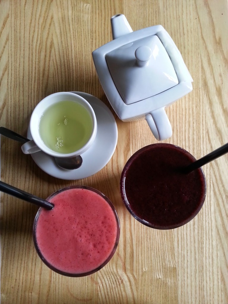 koktajl jagoda i banan (12,00), truskawka i banan (12,00) oraz zielona herbata podawana gratis do zestawu śniadaniowego