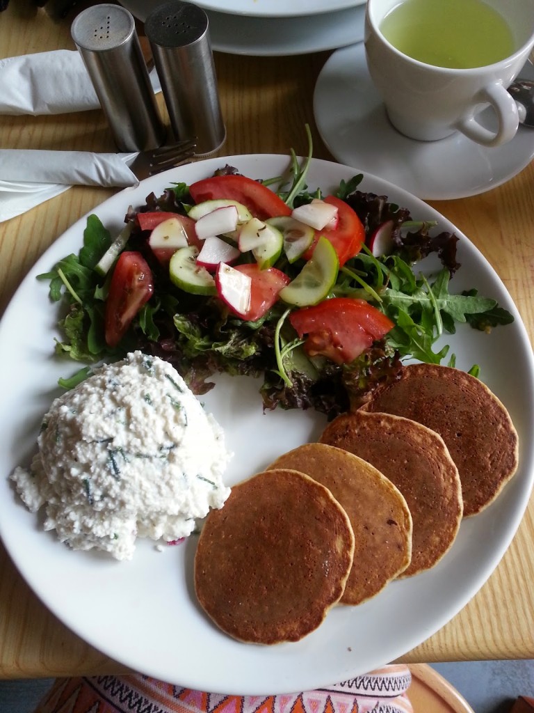 śniadanie – zestaw fit (16,00) – twarożek ze szczypiorkiem i rzodkiewką, placki bezglutenowe, mix sałat z pomidorem, ogórkiem i rzodkiewką – prawdziwa śniadaniowa uczta:) polecam