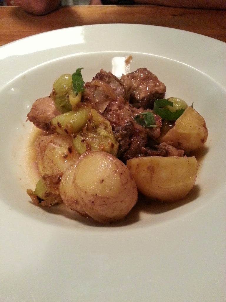 duszona jagnięcina (48,00) – miękkie, rozpływające się w ustach mięso podano z agrestem oraz młodymi ziemniakami. Prawdziwy domowy obiad:)