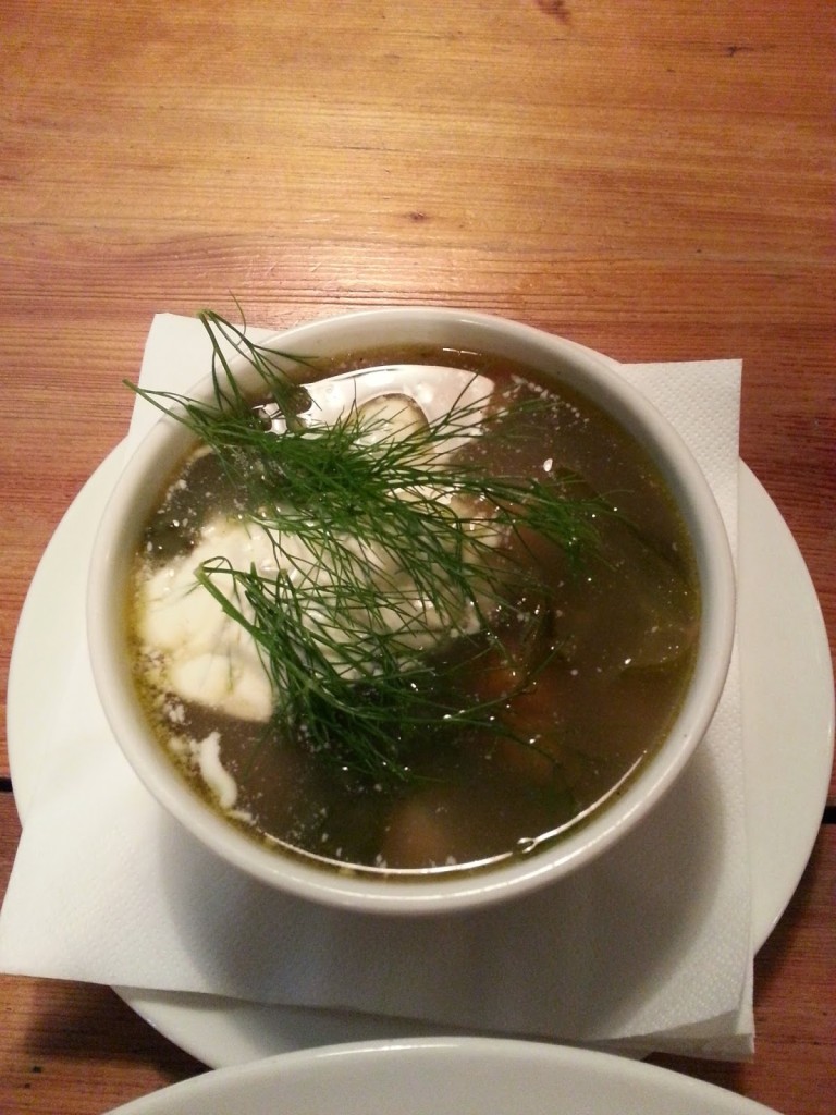 zupa ogórkowa z małosolnych (14,00) zabielona, delikatna i odpowiednio kwaśna, z warzywami i sporą porcją koperku.