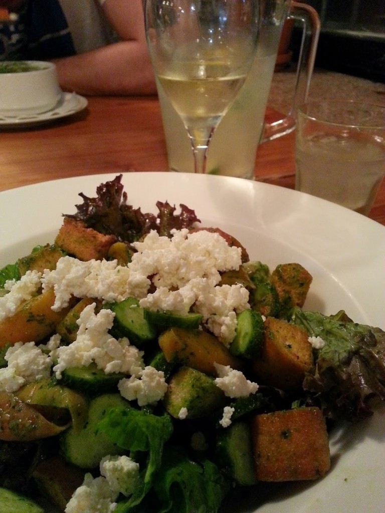 sałatka (25,00) – mieszanka liści od Jabłońskich, ogórka, rzodkiewki, pieczonej brzoskwini z suszonym podlaskim twarogiem oraz sosem z natki pietruszki i grzankami. Do tego polecane białe Pinot Grigio (16,00/ kieliszek). Wyśmienity początek wieczoru