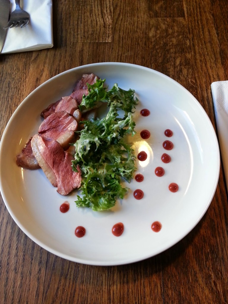 starter 2 – gęś | śliwka | musztarda (18,00) – soczyste, miękkie plastry gęsiny w towarzystwie sałaty skropionej sosem musztardowym oraz musu śliwkowego. Po tym daniu może przekonam się do gęsiny.