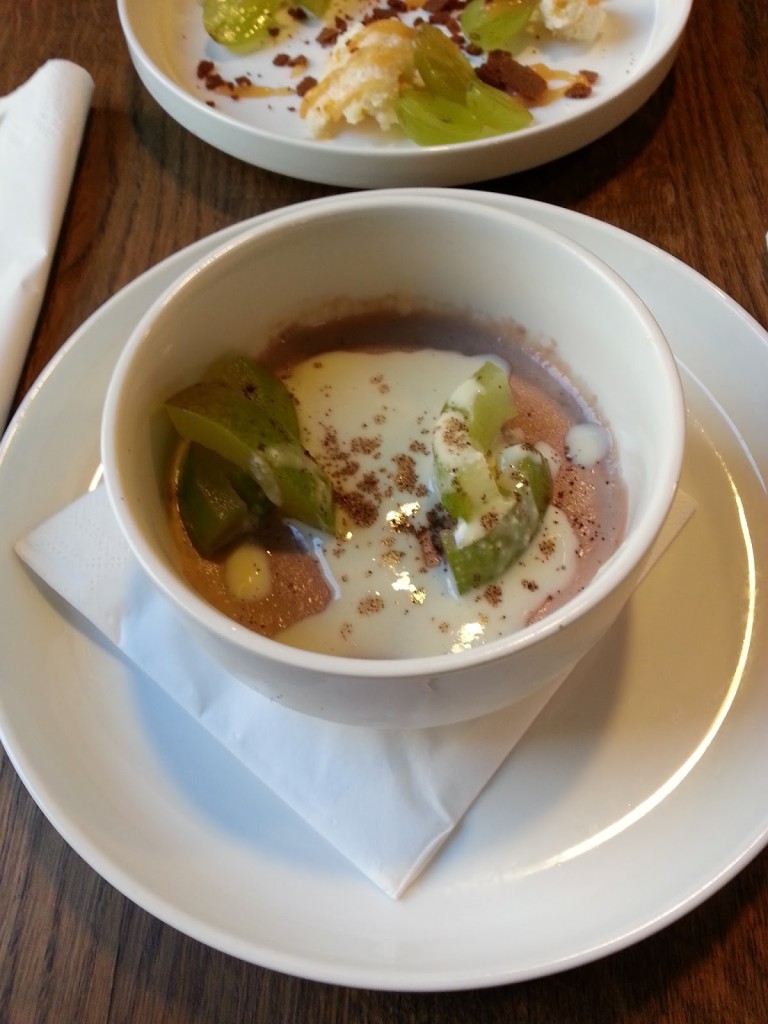 deser – panna cotta – kakao | gruszka | anglaise (16,00) – kakaowa panna cotta, oblana kremem anglaise i posypana kawałkami twardej, kwaśnej gruszki.