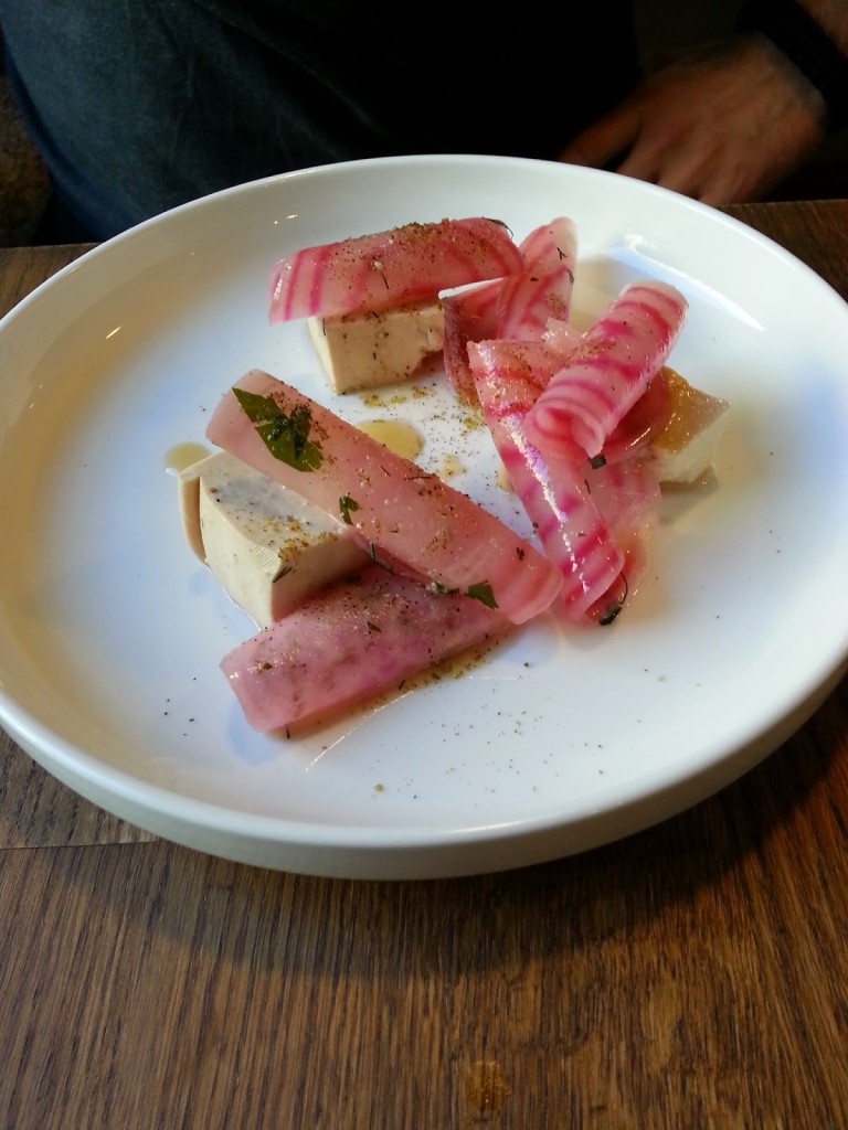 starter 2 – tofu | burak | kolendra (18,00) – twarde, zwarte tofu oraz cieniutkie plasterki buraka – połączenie ciekawe w smaku i wyglądzie