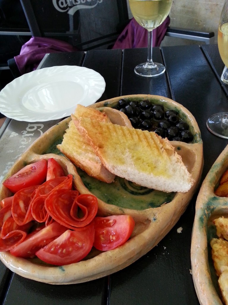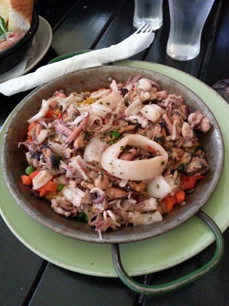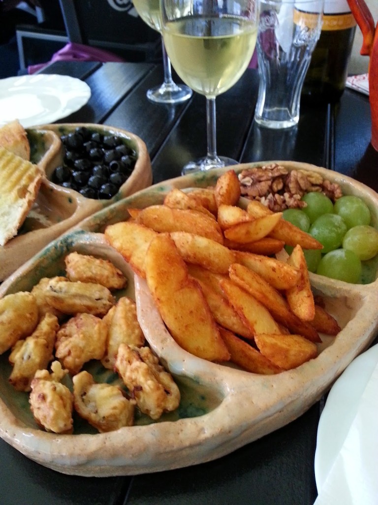 Z dość obszernego menu, pełnego tapas, zup, sałatek, hiszpańskich tortillas oraz paellas wybrałyśmy plaza de tapas (35,00) – duży zestaw przystawek, w skład którego wchodziły marynowane oliwki, smażone ziemniaki, smażone małże, winogrona, orzechy, chorizo z pomidorami, pieczywo. Zestaw był na tyle olbrzymi, że dwie głodne kobiety najadły się nim do syta:) ja wyjadłam małże i część ziemniaków, moja towarzyszka oliwki i chorizo. Zestaw warty jest polecenia.