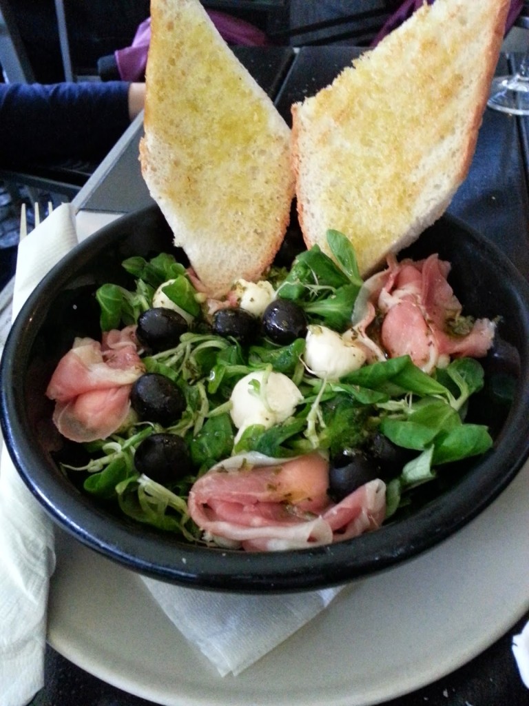 Moja towarzyszka zamówiła sałatkę Iberica (19,00) – z szynką serrano, mozzarellą, pomidorkami, oliwkami i roszponką. Sałatka była bardzo przyzwoita.