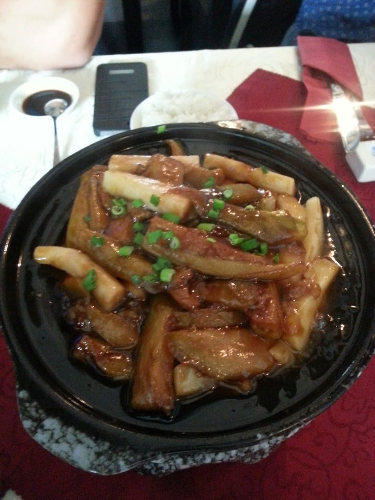 ciasto z bakłażanem gotowanym na parze (28,00) – z czosnkiem, sosem sojowym. Mięsisty, delikatny bakłażan w towarzystwie paluszków z ciasta. Porcja wielka – idealna do podziału pomiędzy 2 lub nawet więcej osób.