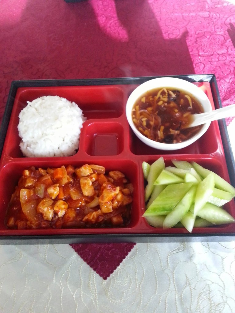 zestaw lunchowy (22,00) – pikantny kurczak w sosie słodko-kwaśnym, ryż, ogórki z czosnkiem, zupa słodko-kwaśna