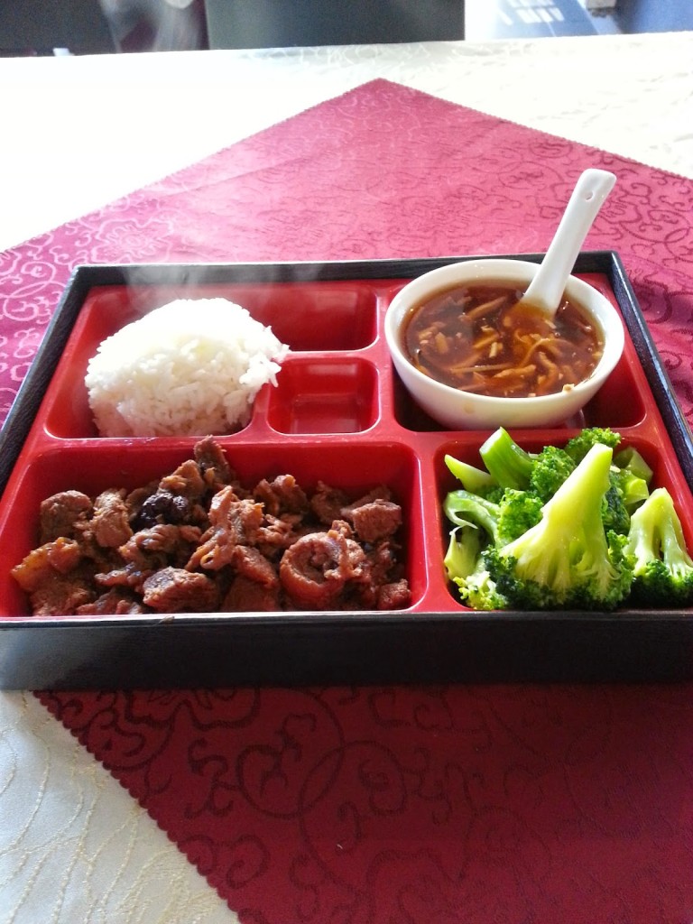 zestaw lunchowy (22,00) – wołowina z anyżem, ryż, brokuły z czosnkiem, zupa słodko-kwaśna