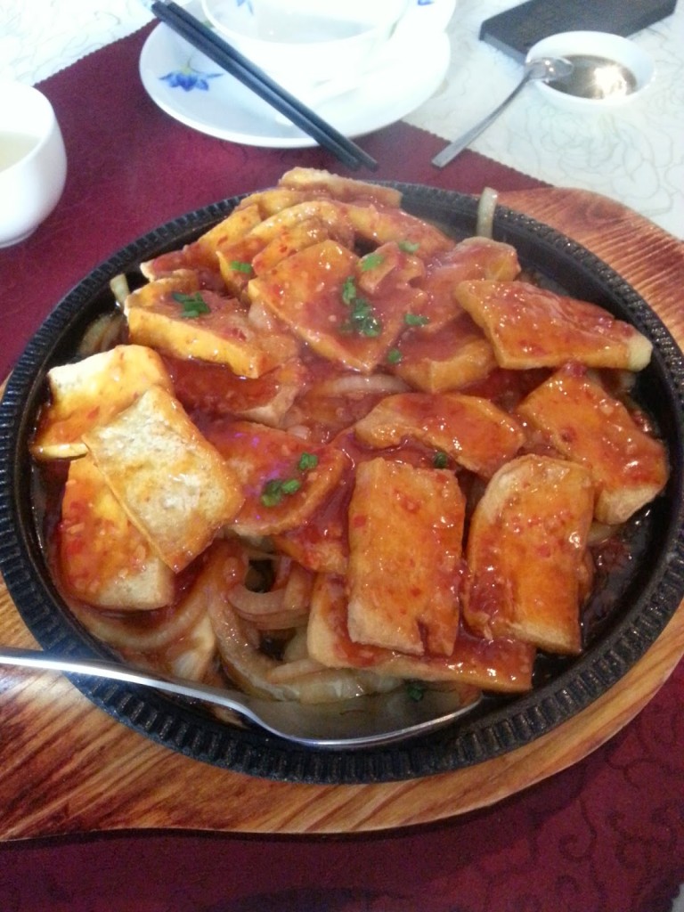 tofu w sosie tajskim (28,00) – olbrzymia porcja świeżego tofu podana z aromatycznym tajskim sosem oraz cebulą, porcja na przy najmniej dwie osoby