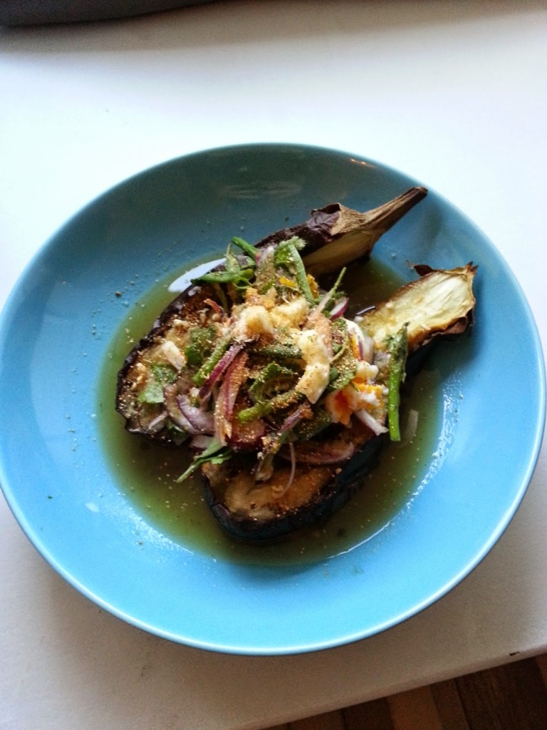 grillowany bakłażan z ziołami (28,00) – z miętą, kolendrą, chili, szalotką, dymką, prażonym ryżem oraz jajkiem. A wszystko skąpane w przepysznym sosie rybnym. Danie, które koniecznie trzeba zamówić dopóki jeszcze jest w karcie. Mam nadzieję, że pozostanie w menu nawet po jej zmianie.