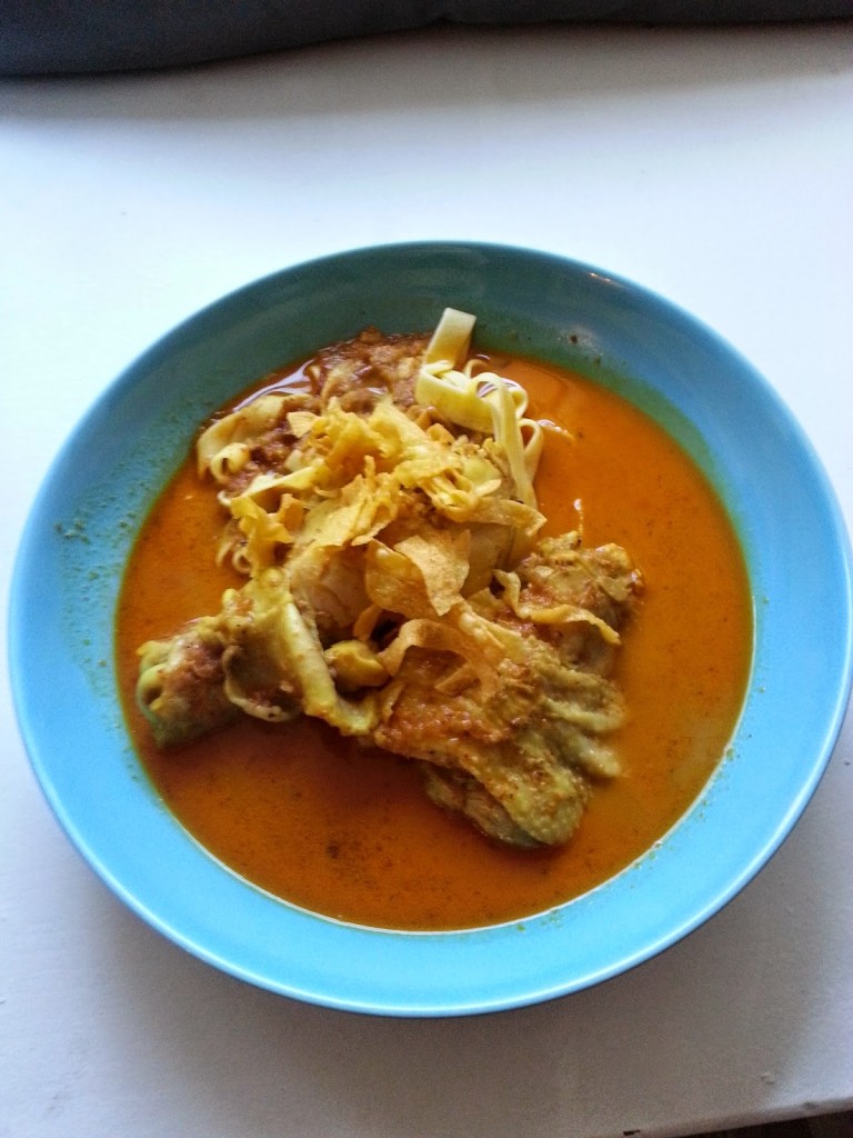 M wybrał zupę khoa soi (25,00) z kurczakiem, mlekiem kokosowym i makaronem. Ostatni zajadaliśmy się nią na północy Tajlandii w Chiang Mai. Ta w my’o’tai była aromatyczna, lekko pikantna, z całym udkiem kurczaka w środku oraz smażonym, chrupiącym makaronem na wierzchu. Miło było przypomnieć sobie ten smak:)