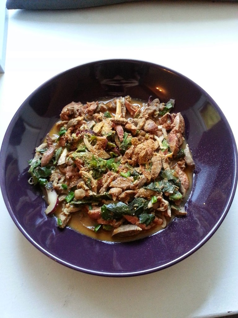 M zdecydował się na podroby drobiowe z ziołami (18,00). Podroby jadamy niezwykle rzadko a to danie już w samym menu brzmiało interesująco i intrygująco – podano je z szalotką kolendrą, miętą, trawą cytrynową, tajską słodką bazylią, dymką, chili i prażonym ryżem. Z opisu wrażeń M jasno wynikało -warto spróbować:)