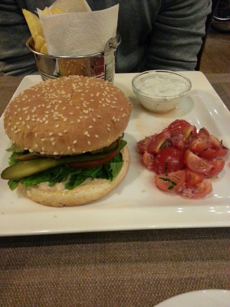 mój towarzysz zdecydował się na burgera z jagnięciny (38,00) – podanego z siekaną cebulą i miętą oraz sałatką z pomidorów i fety a w oddzielnej miseczce sosem tzatziki. Opinię o tym burgerze wydał pozytywną:)