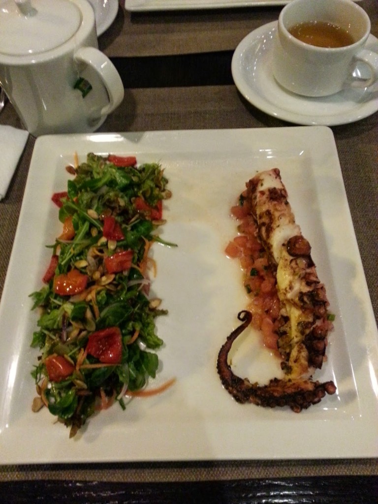 Jako danie główne wybrałam soczystą i chrupiącą grillowaną ośmiornicę (39,00) – podaną w towarzystwie pomidorowej salsy oraz sałatki z rukoli i pomidorków. Danie lekkie (wieczorem lepiej takie znoszę) i choć proste to bardzo dobrze przyrządzone.