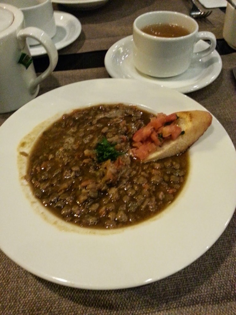 Ja, unikając od pewnego czasu mięsa, skusiłam się na zupę z soczewicy (18,00) – gęstą, lekko pikantną, aromatyczną, rozgrzewającą. Idealną na zimowe chłodne a nawet mroźne dni. Czy wiecie, że we Wrocławiu zawsze jest kilka stopni cieplej niż w Warszawie? A te kilka stopni w zimie robi wielką różnicę:)