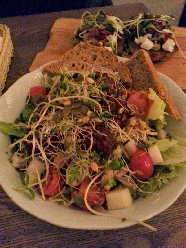 Z krótkiego menu, w którym znajdziecie przystawki mięsne i wege, sałatki, burgery wybrałam sałatkę vege (25,00), którą jadłam już podczas poprzedniej wizyty. To prawdziwe sałatkowe mistrzostwo świata – jarmuż, rukola, sałata lodowa (ale w minimalnej ilości co się chwali), buraczane kulki, grillowana papryka, kalarepa, czerwona cebula, siemię lniane i pestki dyni a do tego wszystkiego domowy winegret z pomarańczy.