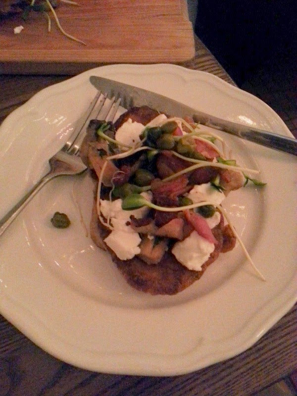 kolejne wybrane danie to bliny z kozim serem (15,00) – podane z kaparami, kiełkami słonecznika, duszonymi na pietruszkowym maśle boczniakami oraz niestety z kawałkami bekonu, których nie zauważyłam w menu (wylądowały na boku talerza). Bliny były puszyste i lekko chrupiące, słone dodatki idealnie przełamywały słodycz ciasta.