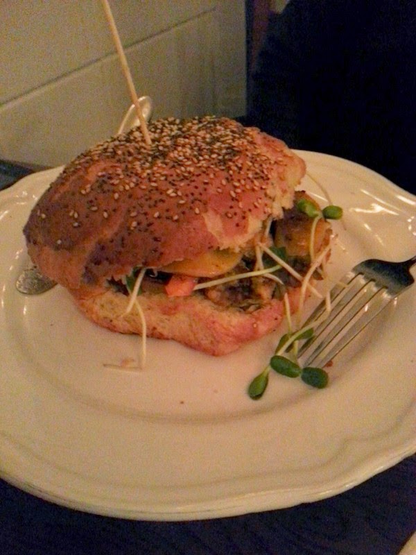 koleżanka wybrała orientalnego kurczakburgera (27,00) z piersią kurczaka marynowaną w limonkowo-kokosowej marynacie, podanego z nektarynkami, kiełkami, grillowaną papryką, kolendrą, sosem z czarnego sezamu.