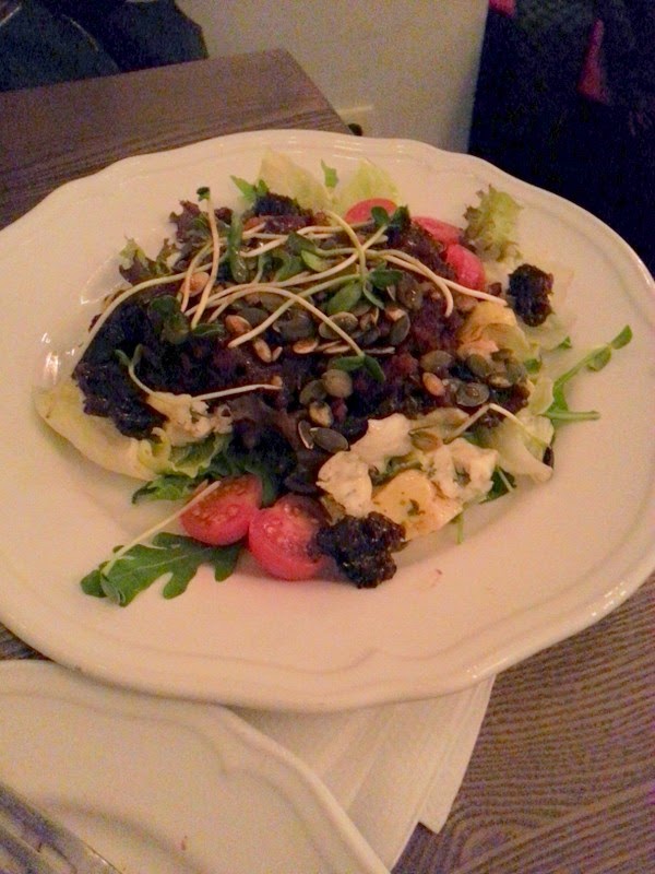 oto moja wersja burgera – dziki burger (25,00) w wersji vege:) buraczany kotlet z kaszą podano na sałacie z gorgonzolą, pieczonym burakiem, rukolą, kiełkami słonecznika oraz domowym sosem z karmelizowanych śliwek. Wielka porcja warzyw – pycha