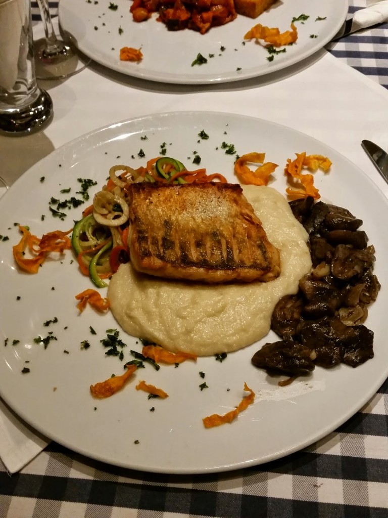 Przyszła pora na dania główne. Pierwsze spoza karty – szczupak (42,00) – wielka porcja świetnej ryby w towarzystwie warzyw w sosie pomidorowym oraz smażonej polenty. Danie które jeżeli zamówione samodzielnie (bez poprzedników w postaci zupy czy przystawki) zaspokoi Wasz głód w zupełności. M wyszedł z Bulaj mega pozytywnie przejedzony rybami