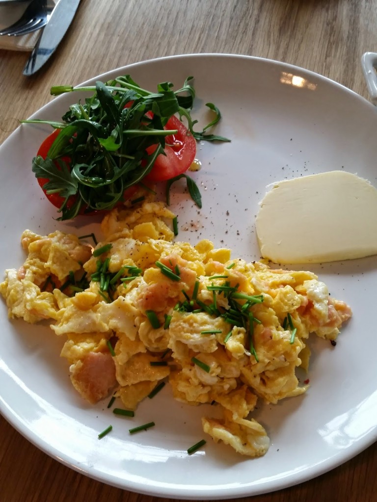 Krótkie menu CHIA Bistro to oferta śniadaniowa (m.in. granola, owsianka, jaglanka, jajecznica, omlet, chia pudding – oczywiście:), ale również pozycja bardziej lunchowe – zupy (rosół, zupa rybna) oraz dania główne (hummus z warzywami, kurczak, łosoś), do tego sałaty i kanapki.Tego dnia, wściekle głodna (co nie jest czymś dla mnie nowym szczególnie po poranku) zamówiłam jajecznicę z łososiem i serem kozim (15,00) na oliwie – na życzenie mocno zesmażoną tak jak lubię.