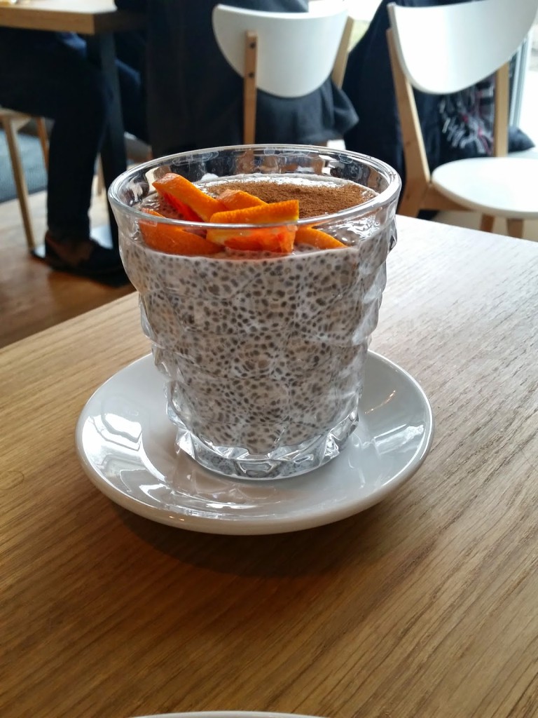 mój towarzysz zdecydował się jedynie na kawę i delikatny chia pudding (10,00) czyli nasiona szałwi hiszpańskiej podane w wielkiej szklance – na mleku, z cynamonem i pomarańczą.
