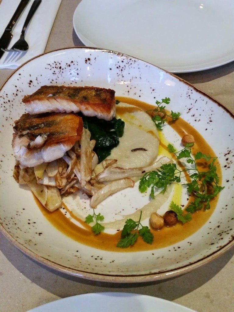 jako danie główne został wybrany smażony sandacz (56,00) podany ze smażonym koprem włoskim, szpinakiem, warzywnym musem oraz prażonymi orzechami. Tu również wszystko grało – świeża ryba, pachnący anyżem i słodki po podsmażeniu koper, czosnkowy szpinak, słodki mus. Danie warte było zamówienia.