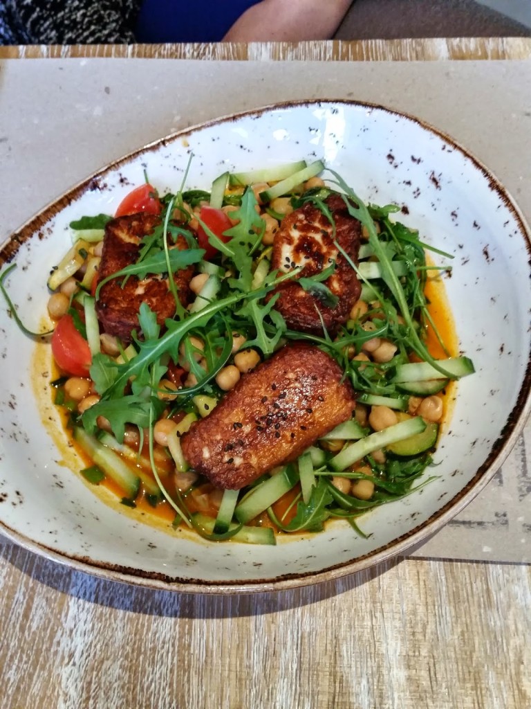 moja towarzyszka wybrała sałatę z serem halloumi (38,00) – z cieciorką, pomidorami, ziołami, w oryginale podawana z chorizo. Na życzenie sałata została podana bez kiełbasy. Porcja była olbrzymia – świeże warzywa, miękki i sprężysty ser, sos, który uzupełnił całą kompozycję. Ta sałata może spokojnie stanowić danie główne.