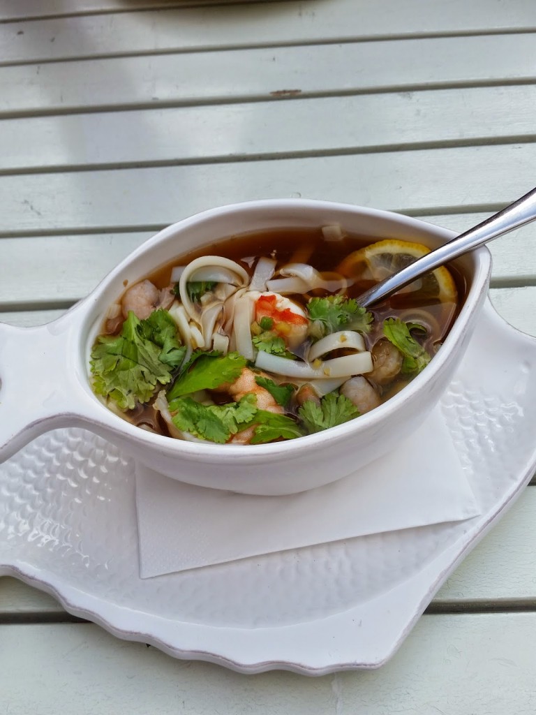 Część z Was już wie, że jeżeli w menu znajduje się zupa rybna to ja ją na pewno zamówię – tym razem nie było inaczej. Ambasada podaje bardzo delikatny ale jednocześnie aromatyczny bulion z owocami morza oraz makaronem ryżowym (23,00) – warty zamówienia