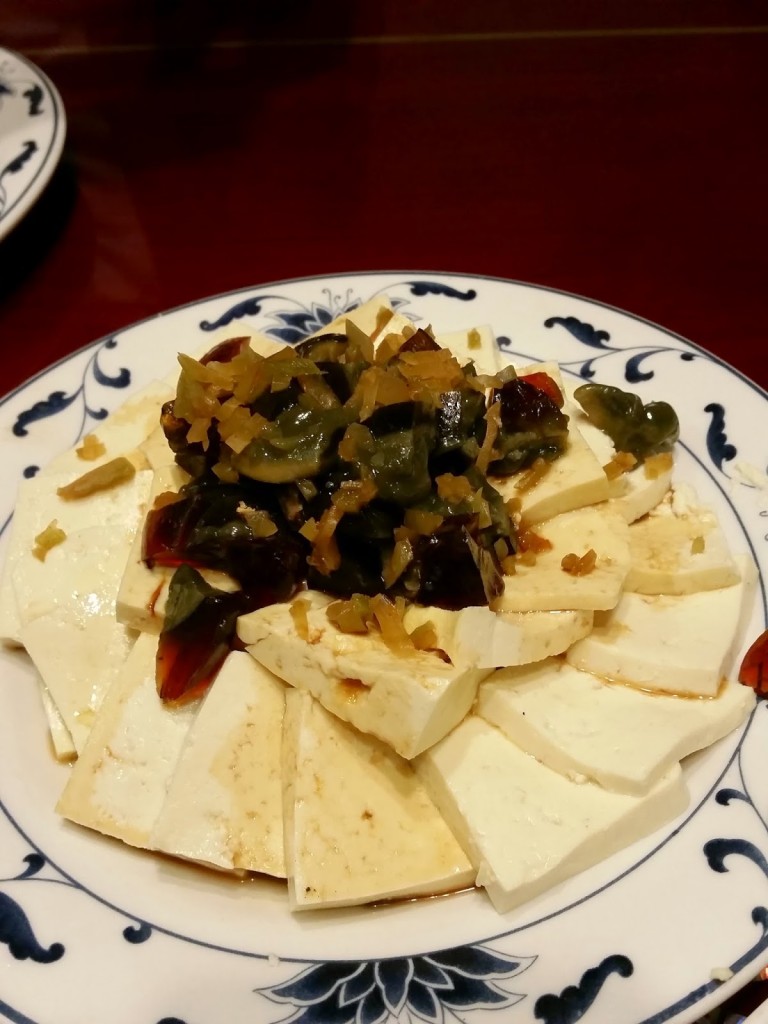 kolejna przystawka – tofu z czarnym jajkiem (18,00) – nazywane jest ono tu jajkiem stuletnim choć w rzeczywistości aż tak stare nie jest. Próbowałam – dla mnie jajko okazało się niejadalne, jednocześnie tofu było soczyste i delikatne.