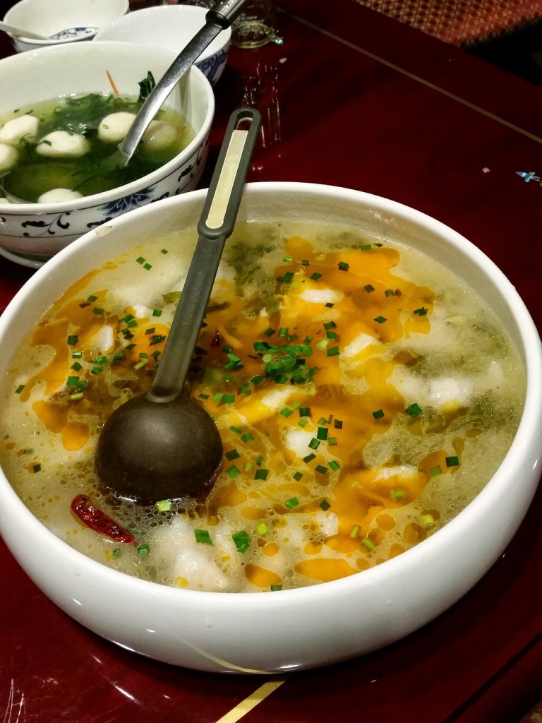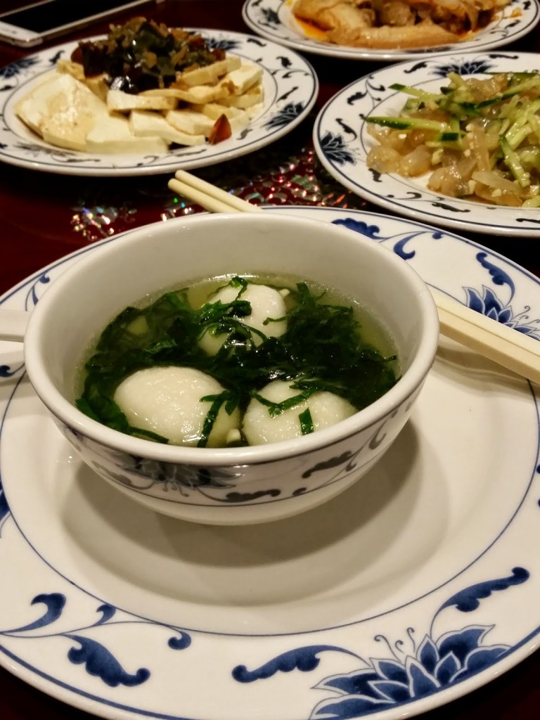 druga z wybranych zup – zupa z rybnymi kulkami (16,00) – też podana w wielkiej misce, z której nakłada się porcję dla siebie. Ta zupa była delikatna, rybne kulki soczyste, zielone liście aromatyczne. Do wszystkiego obowiązkowym dodatkiem był oczywiście biały ryż.