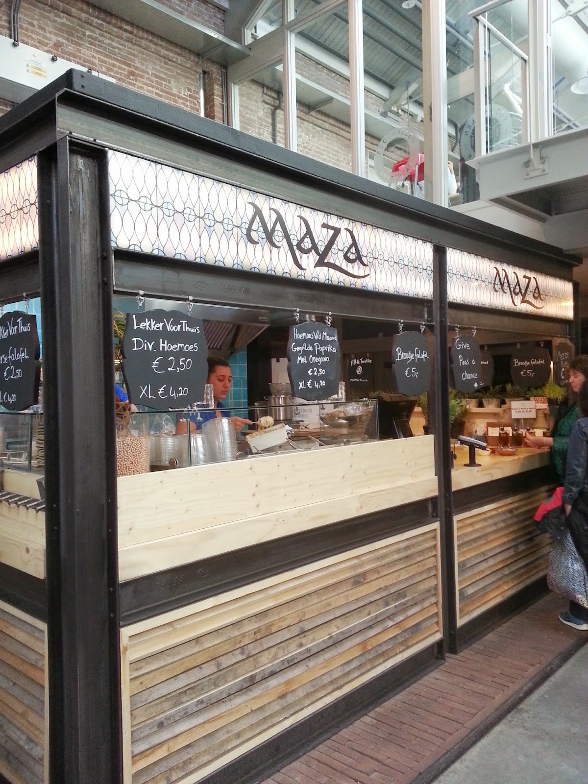 Myślę, że oferta Foodhallen jest w stanie zaspokoić każdego głodomora – są tu stoiska z daniami kuchni tureckiej, wietnamskiej, włoskiej, japońskiej. Są burgery, sery, owoce morza, dania vege a nawet zielone koktajle – wszystko w wersji street food podawane jak z food trucków. Nie mogę nie wspomnieć o barach – serwujących koktajle, piwo i wina – sporo z odwiedzających Foodhallen przychodzi tu właśnie na kieliszek lub szklankę czegoś mocniejszego. Niestety jak na takie miejsce przystało ze znalezieniem wolnego miejsca przy stole czy ławie mieliśmy duży problem. Cóż – dobrze, że miejsce stojące przy beczce po piwie nie było już tak oblegane:)